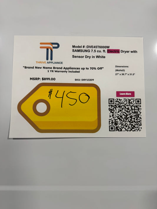 7.5 cu. ft. Vented Stackable Electric Dryer in White with Sensor Dry MODEL: DVE45T6000W SKU: DRY13209
