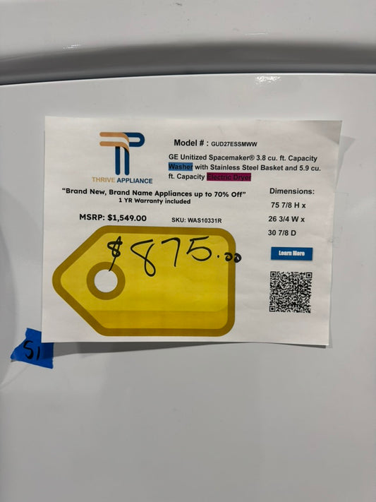 GE Unitized Spacemaker® 3.8 cu. ft. Capacity Washer with Stainless Steel Basket and 5.9 cu. ft. Capacity Electric Dryer MODEL: GUD27ESSMWW SKU: WAS10331R