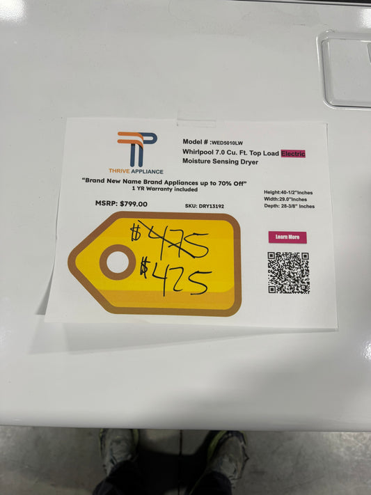 Whirlpool 7.0 Cu. Ft. Top Load Electric Moisture Sensing Dryer MODEL: WED5010LW SKU: DRY13192