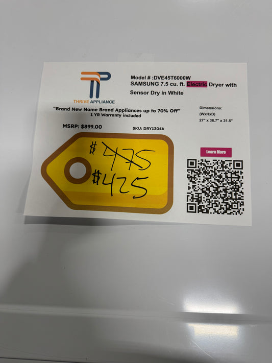 Samsung 7.5 cu. ft. Electric Dryer with Sensor Dry in White MODEL: DVE45T6000W SKU: DRY13046
