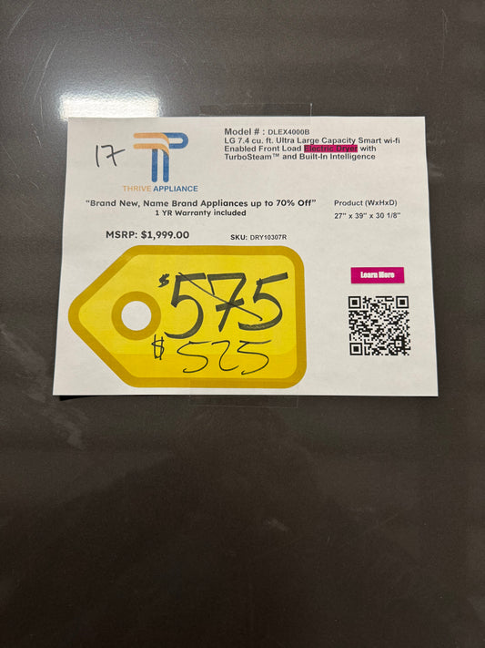 LG 7.4 cu. ft. Ultra Capcity Smart wi-fi Enabled Front Load Electric Dryer with TurboSteam and Built-In Intelligence MODEL: DLEX4000B SKU: DRY10307R