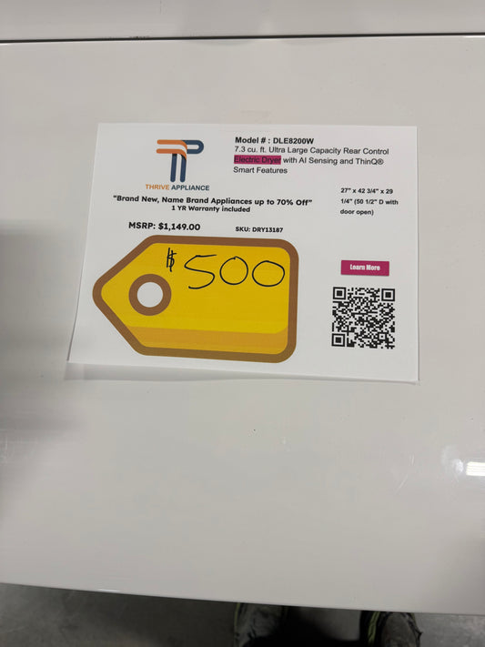 LG 7.3 cu. ft. Ultra Large Capacity Rear Control Electric Dryer with AI Sensing and ThinQ® Smart Features MODEL: DLE8200W SKU: DRY13187