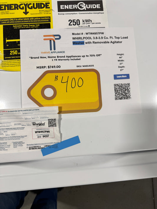 3.8–3.9 Cu. Ft. Whirlpool® Top Load Washer with Removable Agitator MODEL: WTW4957PW SKU: WAS14101