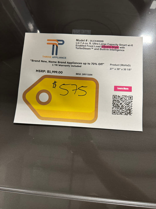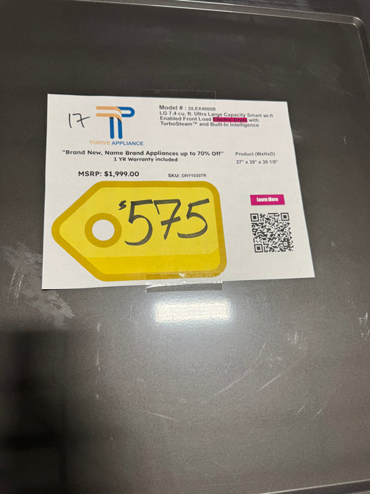 LG 7.4 cu. ft. Ultra Capcity Smart wi-fi Enabled Front Load Electric Dryer with TurboSteam and Built-In Intelligence MODEL: DLEX4000B SKU: DRY10307R