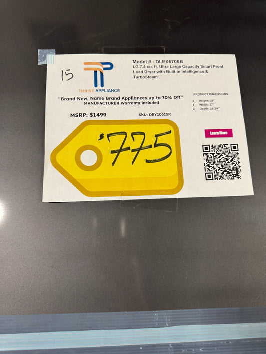 LG 7.4 cu. ft. Ultra Large Capacity Smart Front Load Dryer with Built-In Intelligence & TurboSteam MODEL: DLEX6700B SKU: DRY10315R