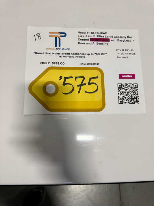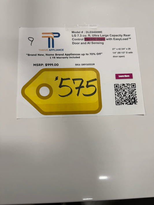 LG 7.3 cu. ft. Ultra Large Capacity Rear Control Electric Dryer with LG EasyLoad™ Door and AI Sensing MODEL: DLE8400WE SKU: DRY10311R
