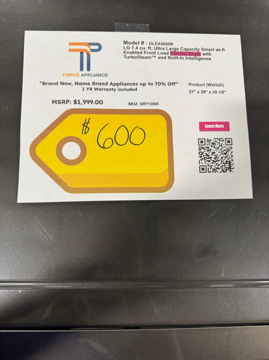 LG 7.4 cu. ft. Ultra Large Capacity Smart Wi-Fi Enabled Front Load Electric Dryer with TurboSteam™ and Built-In Intelligence MODEL: DLEX4000B SKU: DRY10395