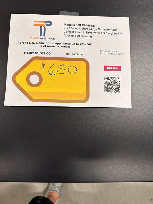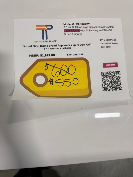 LG 7.3 cu. ft. Ultra Large Capacity Rear Control Electric Dryer with AI Sensing and ThinQ® Smart Features MODEL: DLE8200W SKU: DRY13187