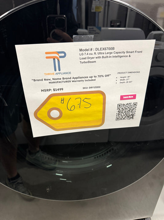 LG 7.4 cu. ft. Ultra Large Capacity Smart Front Load Electric Dryer with Built-In Intelligence & TurboSteam® MODEL: DLEX6700B SKU: DRY13202
