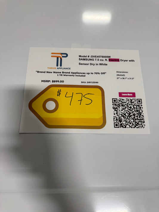 Samsung 7.5 cu. ft. Electric Dryer with Sensor Dry in White MODEL: DVE45T6000W SKU: DRY13046