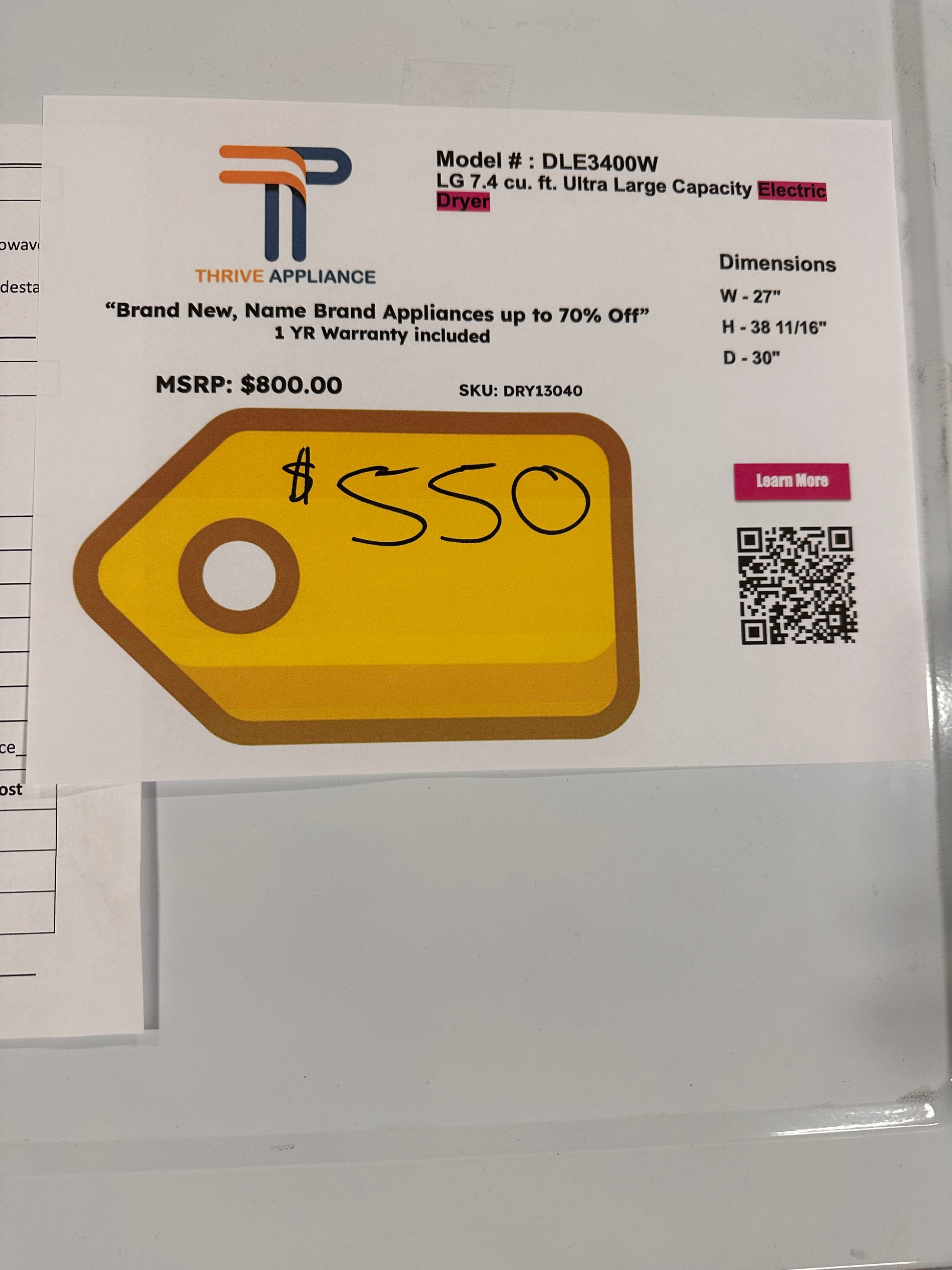 BRAND NEW LARGE CAPACITY LG ELECTRIC DRYER MODEL: DLE3400W DRY13040