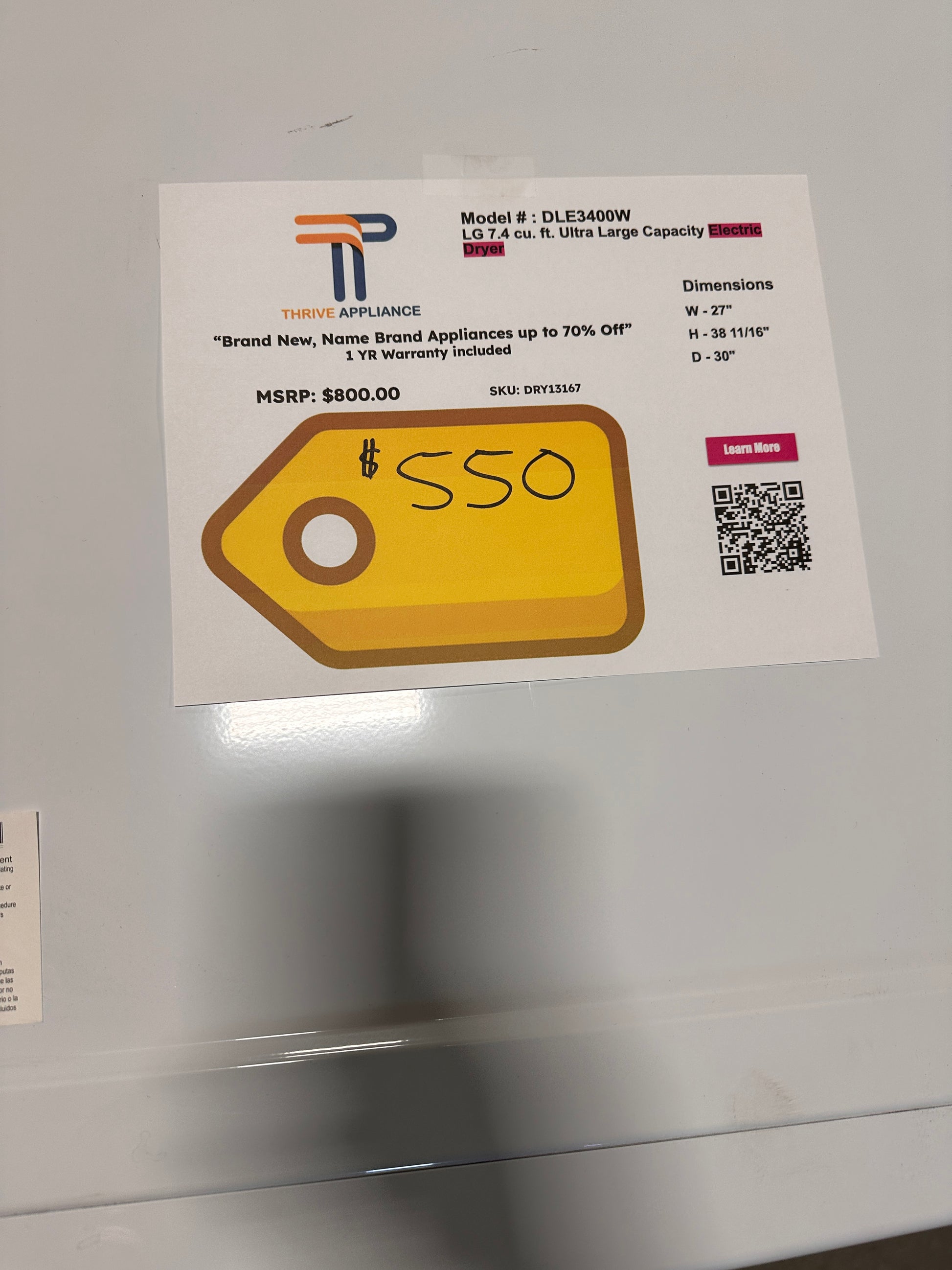 LG 7.4 Cu. Ft. Large Capacity Electric Dryer MODEL: DLE3400W DRY13167