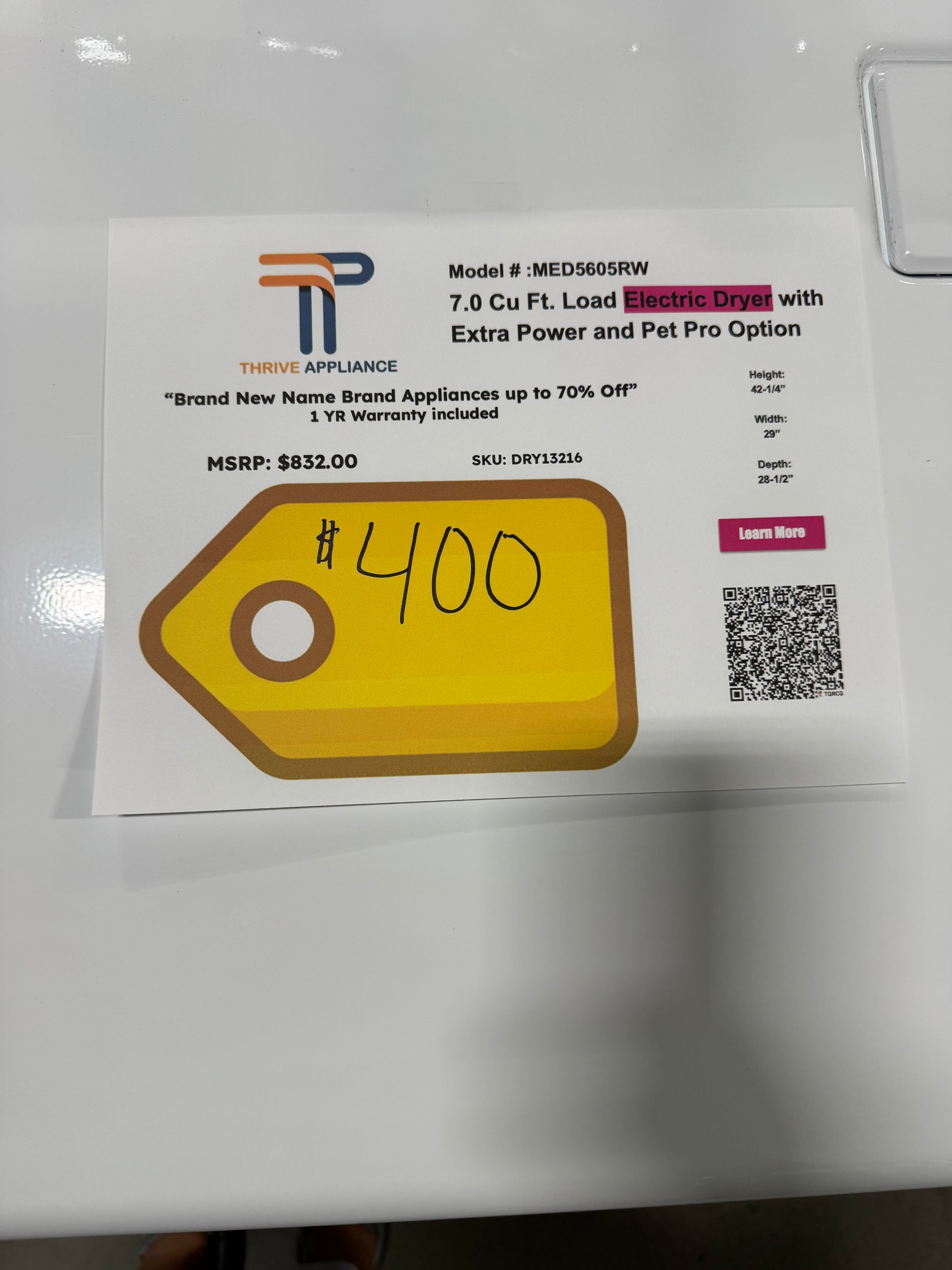Maytag 7.0 Cu Ft. Load Electric Dryer with Extra Power and Pet Pro Option MODEL: MED5605RW SKU: DRY13216