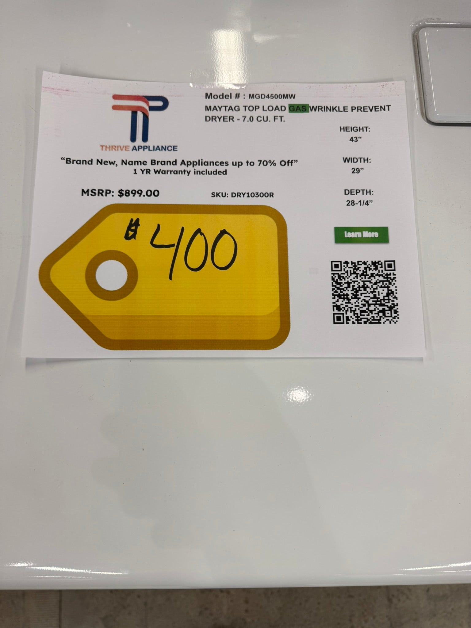 Maytag Top Load Gas Wrinkle Prevent Dryer MODEL: MGD4500MW DRY10300R