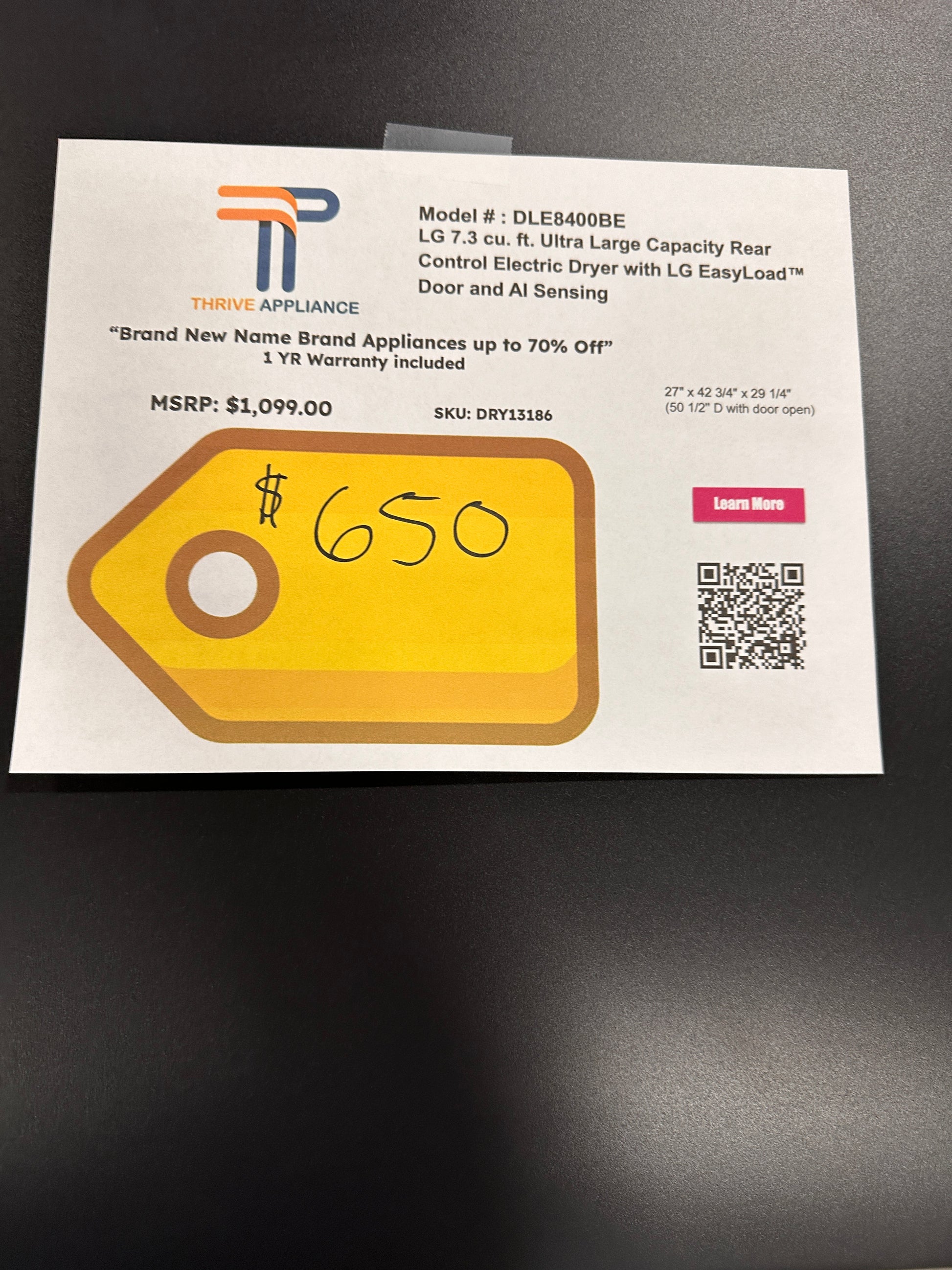 NEW LG 7.3 cu ft Electric Dryer MODEL: DLE8400BE DRY13186