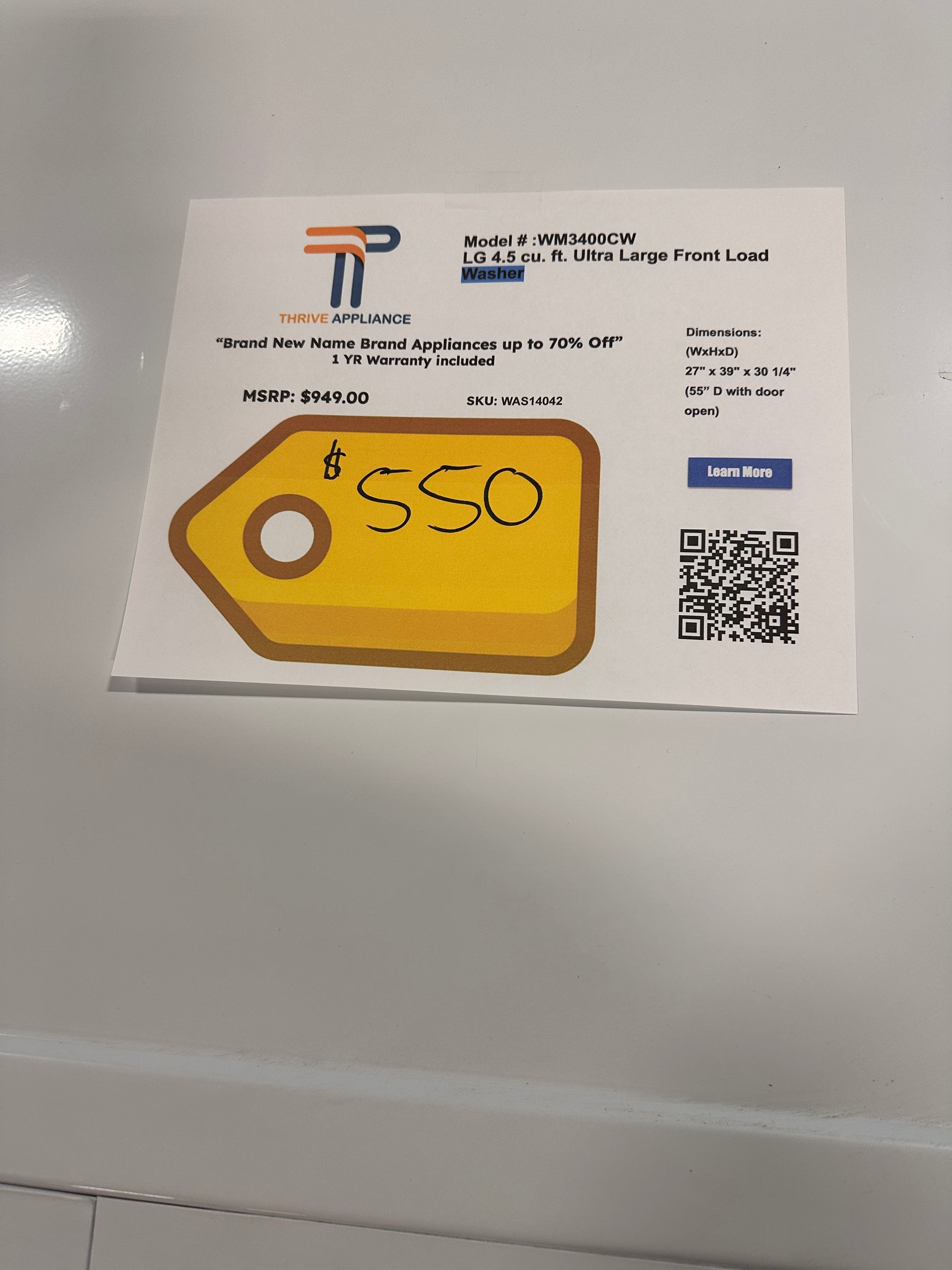 NEW LG ULTRA LARGE FRONT LOAD WASHER MODEL: WM3400CW WAS14042