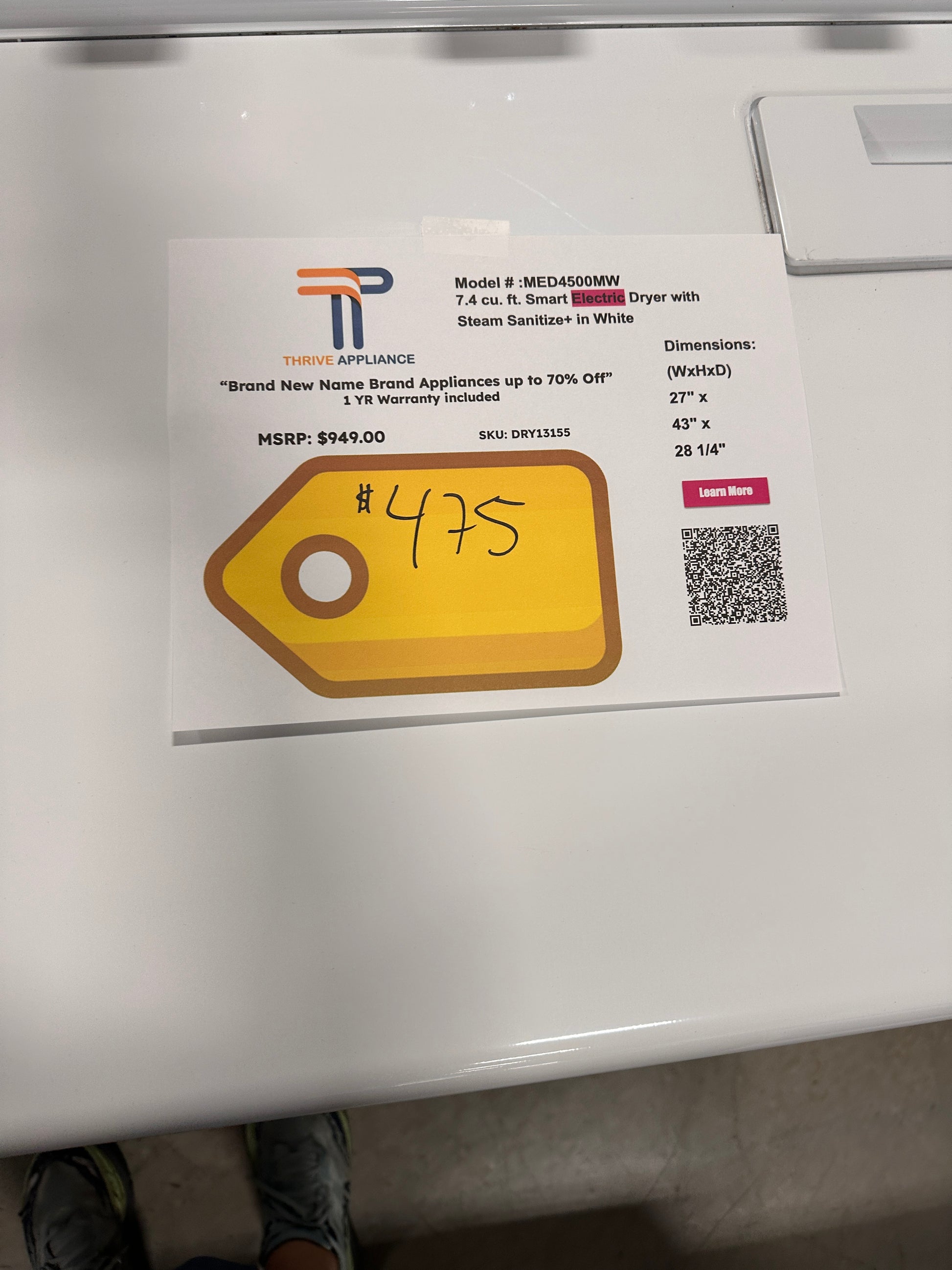 NEW! Maytag Top Load Electric Wrinkle Prevent Dryer MODEL: MED4500MW DRY13155
