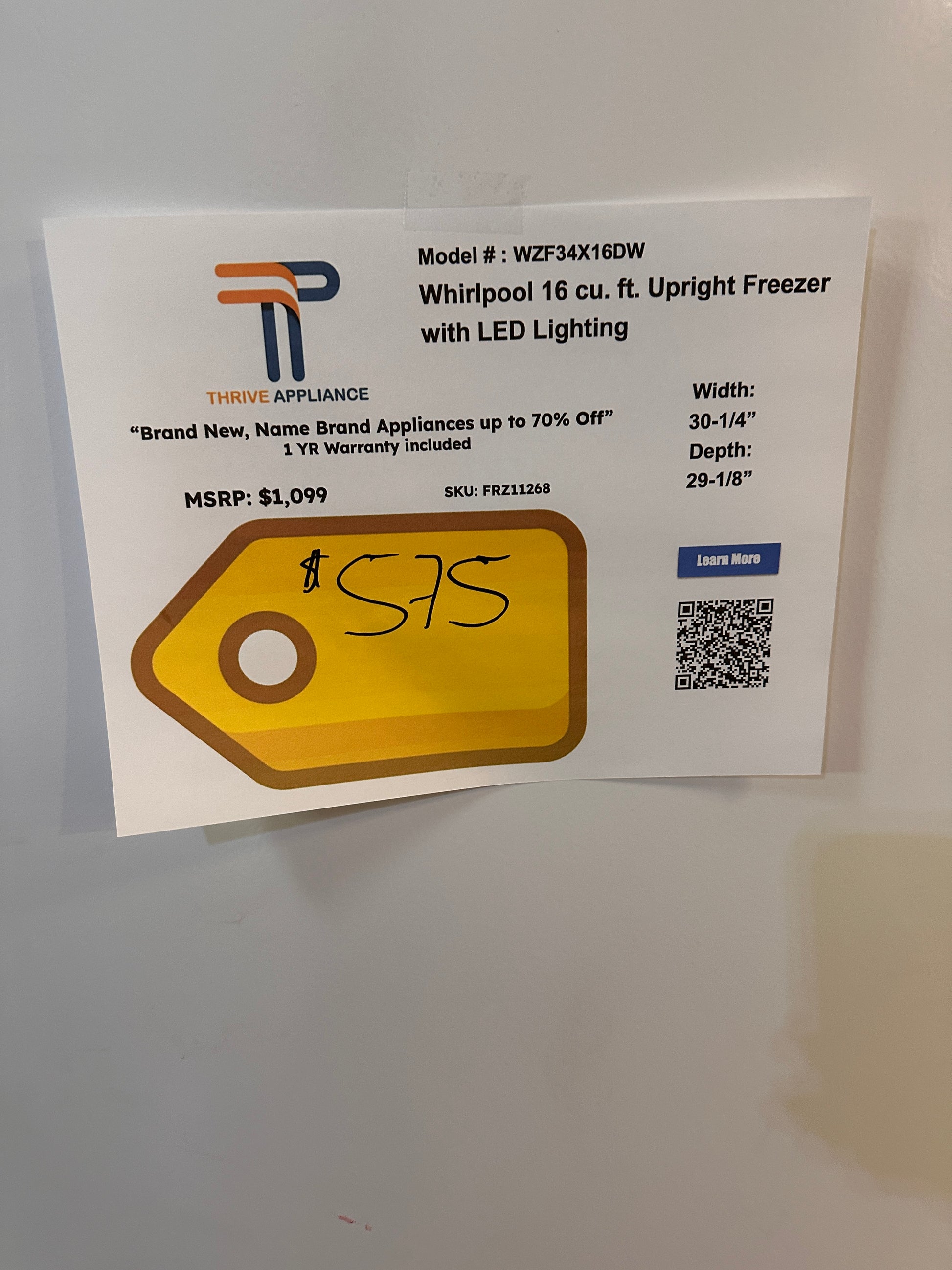 NEW Whirlpool Upright Freezer with LED Lighting MODEL: WZF34X16DW FRZ11268