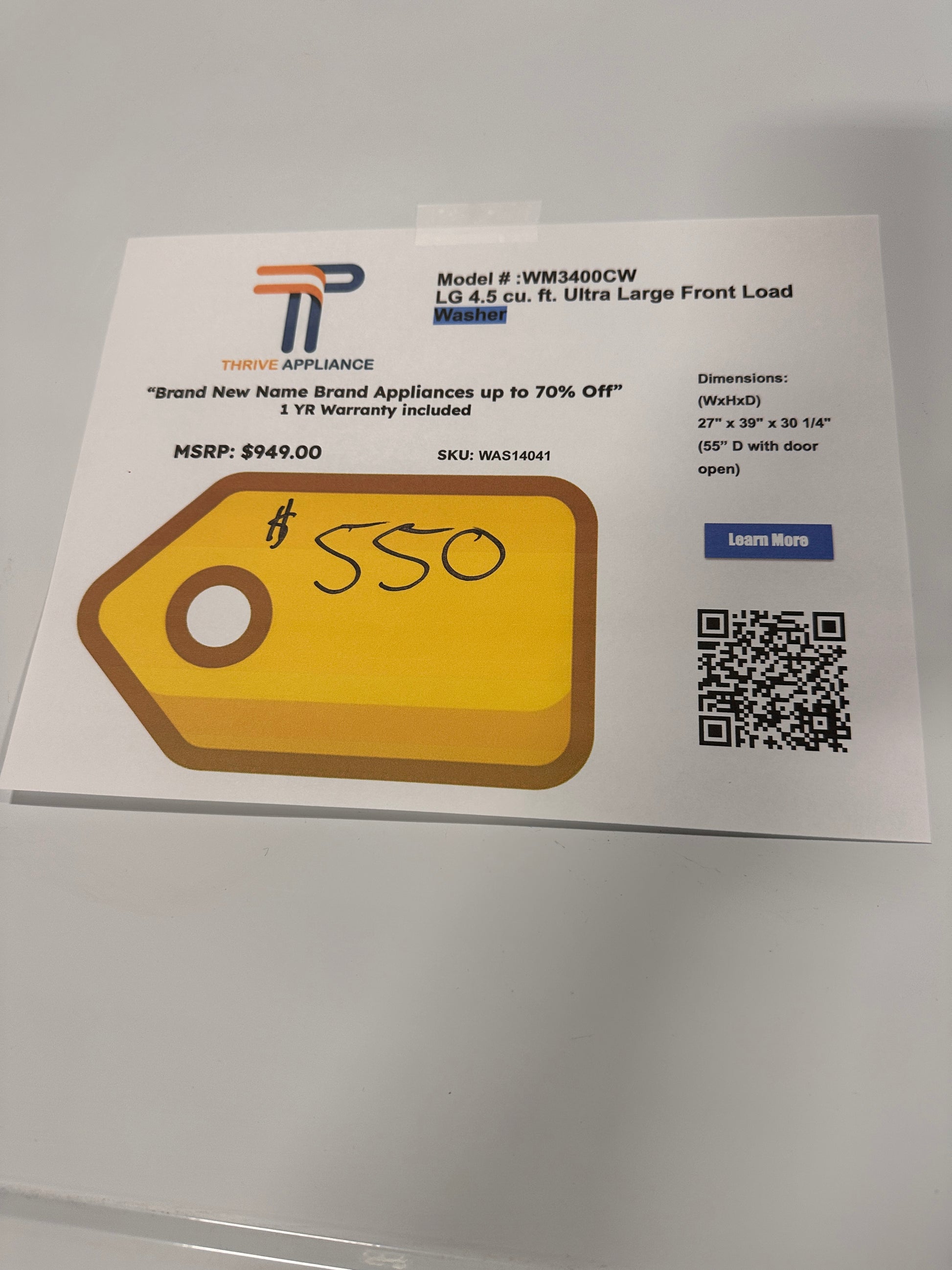 STACKABLE LG ULTRA LARGE FRONT LOAD WASHER MODEL: WM3400CW WAS14041