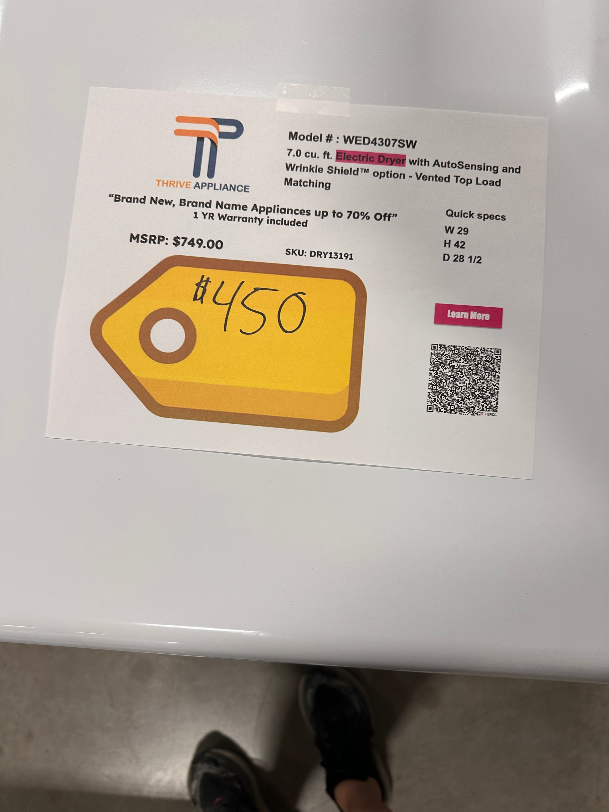 Whirlpool 7.0 Cu. Ft. Electric Dryer with AutoSensing and Wrinkle Shield option MODEL: WED4307SW DRY13191
